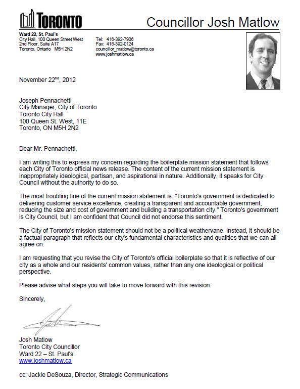 I am writing this to express my concern regarding the boilerplate mission statement that follows each City of Toronto official news release. The content of the current mission statement is inappropriately ideological, partisan, and aspirational in nature. Additionally, it speaks for City Council without the authority to do so.