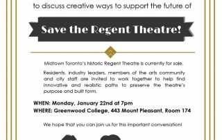 Since the 1920s, the Regent Theatre (once known as the Belsize and then the Crest) has been an iconic theatre on Mount Pleasant Road in the heart of Toronto. This historic landmark has now been put up for sale by the owners. I'm inviting members of our community, arts and culture industry leaders, city staff, [...]
