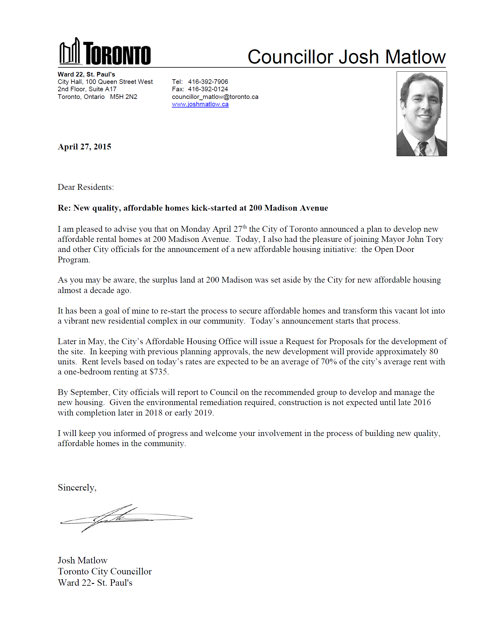 New quality, affordable homes kick-started at 200 Madison Avenue View Larger Image Josh Matlow2017-05-29T19:23:54+00:00 Leave A CommentPlease leave a message of support for residents and frontline staff.Comment Save my name, email, and website in this browser for the next time I comment.