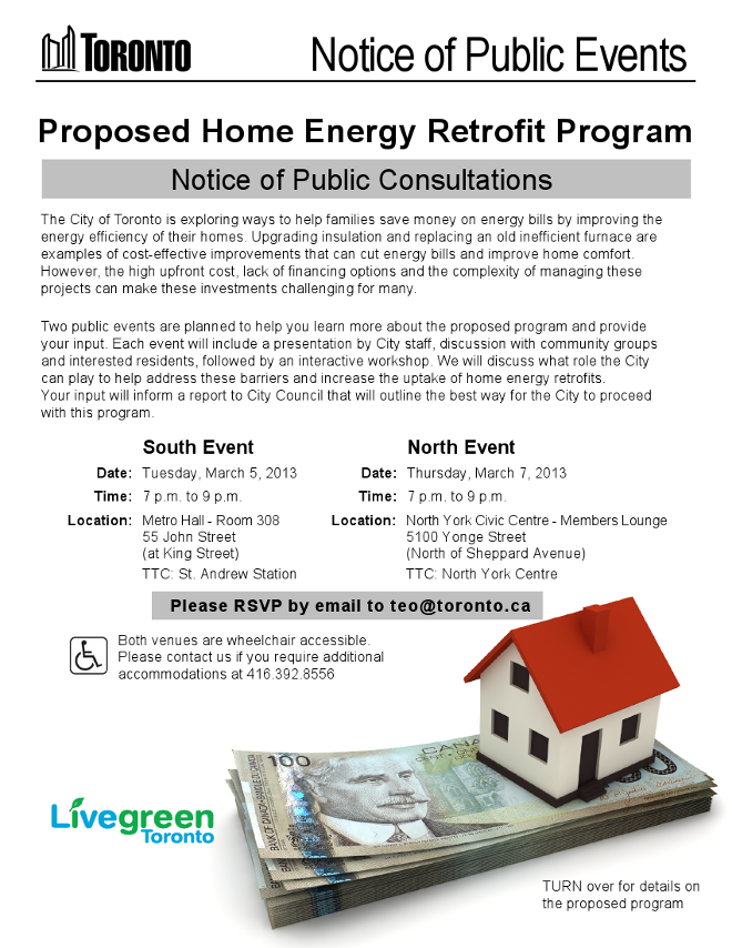 I would like to share the following Notice of Public Consultation with you. The City of Toronto needs your input on a proposed Home Energy Retrofit Program.