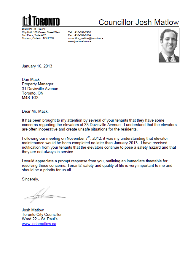 My letter regarding issues at 200 Roehampton Avenue