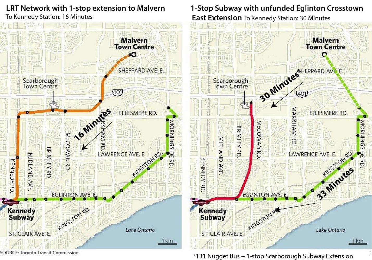 If we chose to put people over politics, and move forward with the planned 7-stop LRT to Sheppard Ave, serving Scarborough Town Centre and Centennial College, the City would be able to afford to build the 17-stop Crosstown extension and be in a better position to provide rapid transit that will have a positive impact on the lives of Malvern residents. An extension of the Scarborough LRT Phase 2, which was already planned for in the 2010 Environmental Assessment, shows that it would take 16 minutes to travel from Malvern Town Centre to Kennedy, while it would take over 33 minutes using the Eg Crosstown extension through UTSC