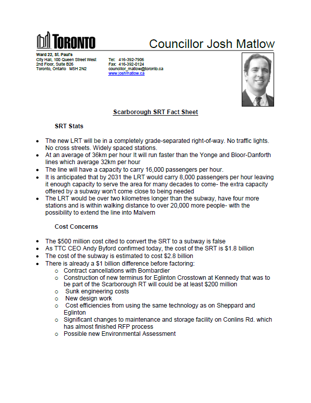 There has been a lot of misinformation regarding the potential conversion of the Scarborough SRT to a subway. The facts – based on land use planning, ridership projections and a cost/benefit analysis, not votes – suggest replacing the aging Scarborough SRT with an LRT, just as was agreed upon last year when Council reached an agreement. For additional background on this current transit discussion, please read my newsletter from May 1.