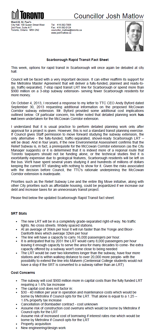Please find below the updated Scarborough Rapid Transit fact sheet: