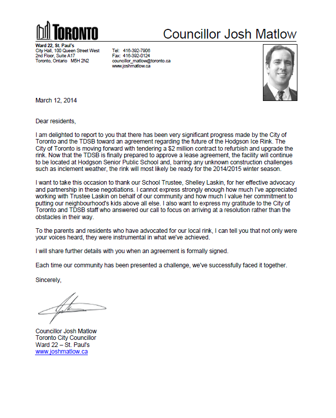 I am delighted to report to you that there has been very significant progress made by the City of Toronto and the TDSB toward an agreement regarding the future of the Hodgson Ice Rink. The City of Toronto is moving forward with tendering a $2 million contract to refurbish and upgrade the rink. Now that the TDSB is finally prepared to approve a lease agreement, the facility will continue to be located at Hodgson Senior Public School and, barring any unknown construction challenges such as inclement weather, the rink will most likely be ready for the 2014/2015 winter season.