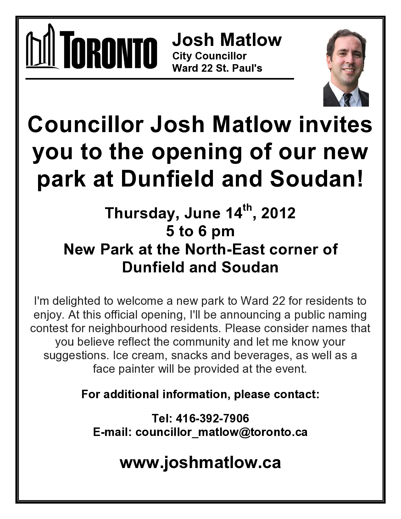 Opening of Ward 22’s newest park at Dunfield and Soudan View Larger Image Josh Matlow2017-05-29T19:25:18+00:00 Leave A CommentPlease leave a message of support for residents and frontline staff.Comment Save my name, email, and website in this browser for the next time I comment.