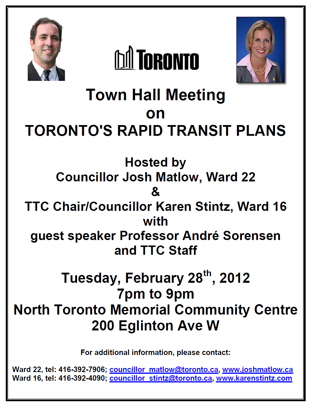 NOTICE: Town Hall Meeting on Toronto’s Rapid Transit Plans hosted by Councillors Josh Matlow & Karen Stintz