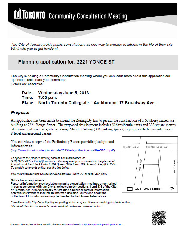 An application has been made to amend the Zoning By-law to permit the construction of a 56-storey mixed use building at 2221 Yonge Street.  The proposed development includes 506 residential units and 338 square metres of commercial space at grade on Yonge Street.  Parking (306 parking spaces) is proposed to be provided in an 8-level underground garage.