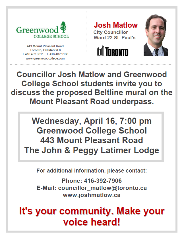 NOTICE: Greenwood College School Beltline Mural Public Meeting View Larger Image Josh Matlow2017-05-29T19:24:11+00:00 Leave A CommentPlease leave a message of support for residents and frontline staff.Comment Save my name, email, and website in this browser for the next time I comment.