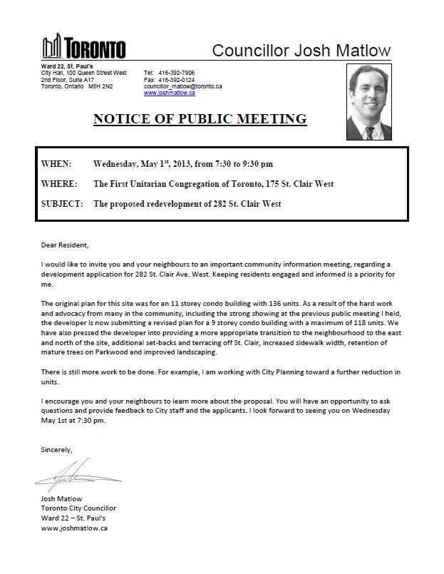 I would like to invite you and your neighbours to an important community information meeting, regarding a development application for 282 St. Clair Ave. West. Keeping residents engaged and informed is a priority for me.