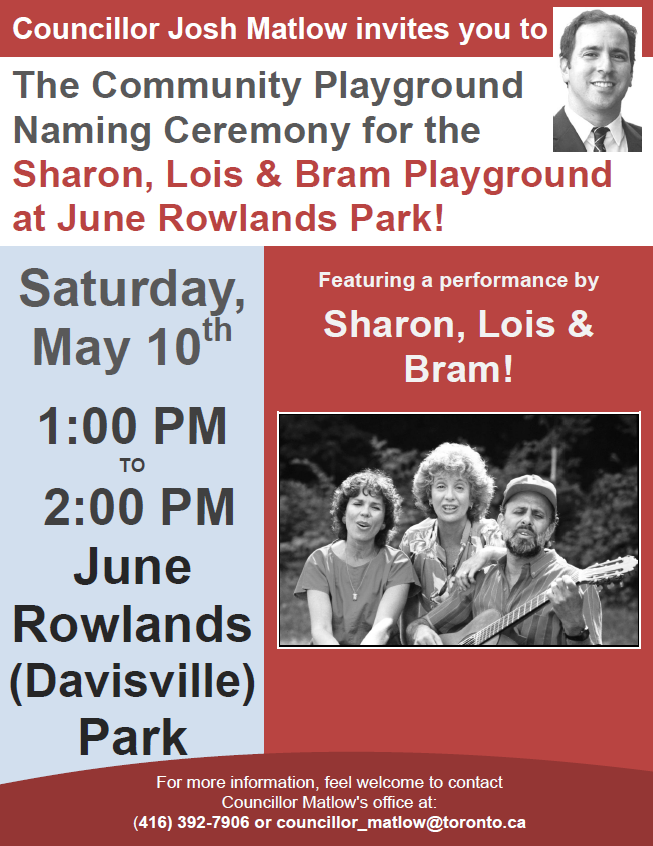 Sharon, Lois & Bram Playground Naming Ceremony and Performance: May 10, 1 pm, at June Rowlands (Davisville) Park!